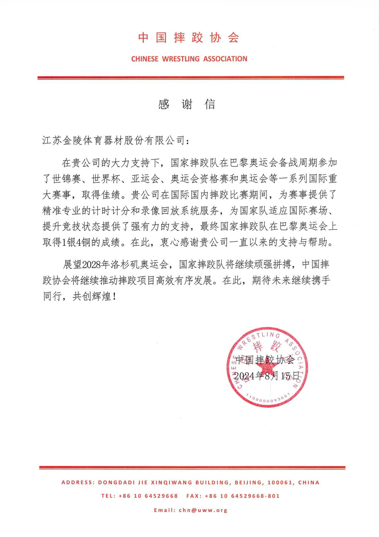 近日,中國(guó)摔跤協(xié)會(huì)向金陵體育發(fā)來感謝信,感謝金陵體育為中國(guó)國(guó)家摔跤隊(duì)奧運(yùn)爭(zhēng)光做出的貢獻(xiàn)。