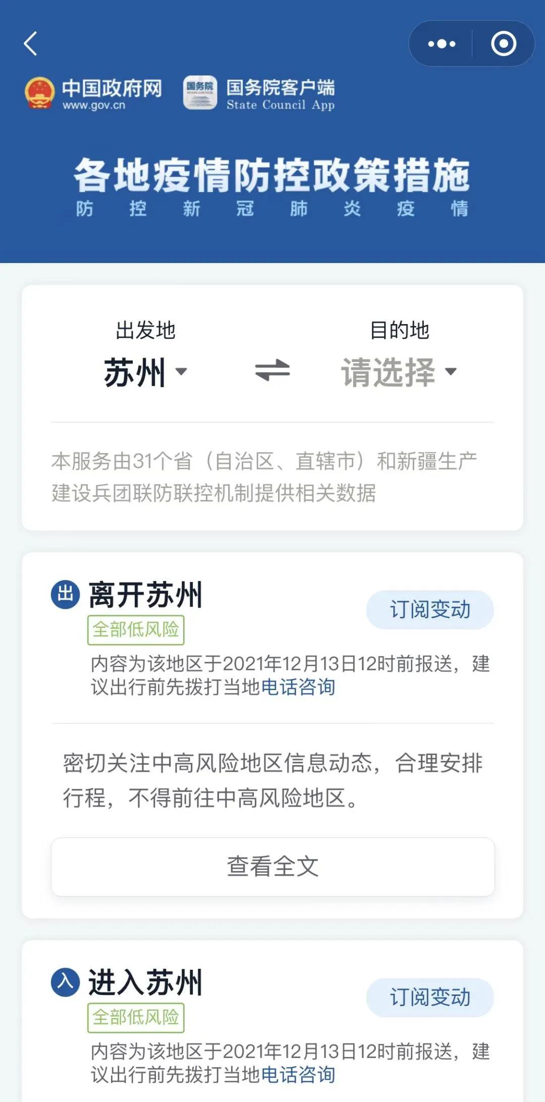 最近要出門,不知道出發(fā)地、目的地都有什么疫情防控政策措施?別著急,兩步教你查詢!在“張家港發(fā)布”微信菜單欄打開“國(guó)務(wù)院客戶端”小程序,進(jìn)入后搜索“各地疫情防控政策措施”,即可搜索查詢相關(guān)信息!