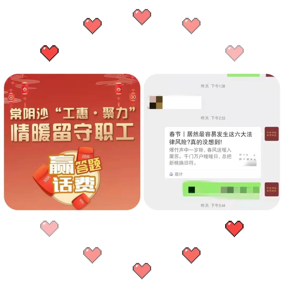 正月初一至初五常陰沙工聯(lián)會(huì)線上開展新春答題贏話費(fèi)活動(dòng)。通過微信群等推送“以案釋法”案例等方式,為留守職工宣傳“喝酒不開車,開車不喝酒”“喝酒需謹(jǐn)慎,勸酒須擔(dān)責(zé)”等春節(jié)期間常見問題,同時(shí)也宣傳了疫情防控信息和知識(shí)。